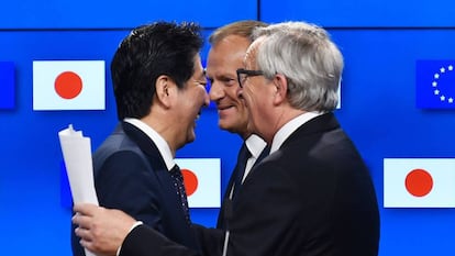 Las crisis suelen aparecer de repente, sin previo aviso. Pero en este caso no es así. El nuevo inquilino de la Casa Blanca venía avanzando sus posiciones desde la campaña electoral estadounidense, y no ha hecho más que aplicar su programa. Europa reacciona tratando de ocupar el espacio que deja Trump: la canciller alemana, Angela Merkel, estrechó el miércoles lazos con el presidente chino Xi Jinping, y la UE lanzó un mensaje político de primer nivel con la firma de un principio de acuerdo comercial con Japón, histórico socio de EE UU y prácticamente un protectorado norteamericano durante décadas. Europa coquetea con Canadá, México, el Mercosur y ahora con China y Japón. “Algunos dicen que vuelven el aislacionismo y la desintegración, pero estamos demostrando que no es así, que el mundo no tiene necesidad de volver 100 años atrás”, apuntaron al alimón el presidente del Consejo Europeo, Donald Tusk, y el jefe de la Comisión, Jean-Claude Juncker.