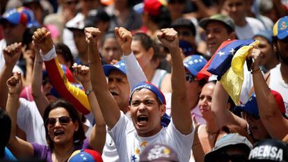 La oposición volvió ayer a concentrarse en Caracas para celebrar un ciclo ininterrumpido de manifestaciones que se inició cuando a finales de marzo el Gobierno de Maduro decidió dejar sin competencias al Parlamento, donde el chavismo está en minoría. Los cuadros y los simpatizantes de la MUD quieren demostrar que la presión social sigue intacta y que no se conforman con la excarcelación de López. El exalcalde del municipio caraqueño de Chacao pidió el sábado continuar la lucha y aseguró que no se da por vencido. “Reitero mi compromiso de luchar hasta conquistar la libertad, pueblo de Venezuela”, dejó claro en un mensaje leído por Freddy Guevara, miembro destacado de su formación, Voluntad Popular.
