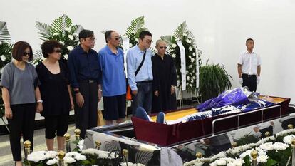 En las imágenes distribuidas por el ayuntamiento de Shenyang, la ciudad donde el disidente murió de un cáncer de hígado este jueves, se ve una habitación sin ventanas decorada con coronas de flores blancas, el color del luto en Asia. Presidiendo la escena, para que no quepa dudas a quienes vean las imágenes, un gran crespón negro en el que se lee “funeral por Liu Xiaobo”. En el centro de la sala, el ataúd con el cuerpo del activista, crítico literario, comentarista y poeta. A un lado, media docena de familiares. En un extremo, su viuda, Liu Xia, con su característica cabeza afeitada, de negro riguroso y los ojos cubiertos por gafas de sol. Fragilísima, parece necesitar que otros la sujeten para mantenerse en pie, mientras da el último adiós a su esposo o sostiene una fotografía de él en blanco y negro.