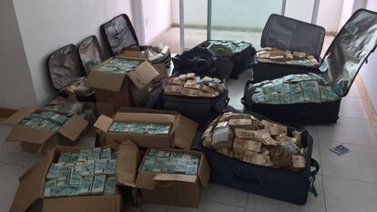 Las imágenes divulgadas por la policía del hallazgo en el escondrijo en la ciudad de Salvador de Bahía son impresionantes: fueron recogidas al menos nueve maletas y siete cajas de cartón abarrotadas de billetes de 100 y 50 reales, los de más valor en Brasil (el real está a un cambio 3,7 por euro). Los agentes llegaron al lugar donde el dinero estaba almacenado después de recibir una denuncia de que el hombre que hasta finales del año pasado fue ministro de la Secretaría de Gobierno de Michel Temer estaría escondiendo documentos relacionados con una de las investigaciones sobre él. El inmueble donde estaba la montaña de dinero no es propiedad del político, pero él lo tenía alquilado y había comunicado al dueño que lo usaría para guardar documentos de su padre muerto.