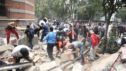 A las 13.14 hora local (20.14 hora peninsular española) el suelo volvió a retumbar en México, apenas 10 días después del terremoto de mayor magnitud (8,2) en 85 años. El de este martes, con epicentro en los límites de Morelos y Puebla, fue menor, de 7,1, pero su proximidad a la capital ha provocado que los daños sean mucho mayores. El caos y el pánico se apoderaron de la ciudad. Más de 40 edificios se vinieron abajo, entre ellos dos escuelas. En una de ellas, Rebsamen, el presidente del país, Enrique Peña Nieto, confirmó pasadas las diez de la noche que habían muerto al menos 21 niños y otros 30 seguían desaparecidos. A última hora de la noche del martes, la ciudad seguía herida, pero no cesaban los trabajos de rescate para tratar de sacar supervivientes de los escombros. La solidaridad de los ciudadanos, que se echaron a las calles para colaborar con los damnificados, fue imparable.