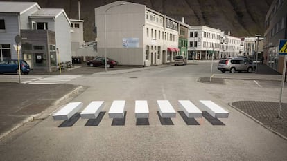 Ísafjörður tiene unos 3.000 habitantes y la casa más antigua de Islandia. Desde el jueves pasado esta pequeña ciudad pesquera, capital de la región de los Fiordos del Noroeste, tiene además de sus pintorescas casitas de madera, una nueva atracción turística: un paso de cebra cuyas barras, gracias a un efecto óptico, parecen flotar tridimensionales sobre la calzada. La idea es que al verlo los conductores frenarán. El efecto inmediato es que un anodino cruce de Ísafjörður se ha hecho famoso.