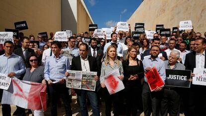 Con banderas y periódicos manchados de sangre, varios periodistas se han reunido este jueves delante del Parlamento para decir que no se dejarán intimidar. "No vamos a dejar que nos intimiden. No tenemos miedo", ha señalado Herman Grech, redactor jefe de la página web Times of Malta. Los periodistas pidieron además que la investigación sobre el asesinato de Daphne Caruana Galizia garantice la protección de sus fuentes. Este domingo, todos los periódicos de la isla han decidido publicar la misma portada, además de convocar otra manifestación delante del Palacio de Justicia.