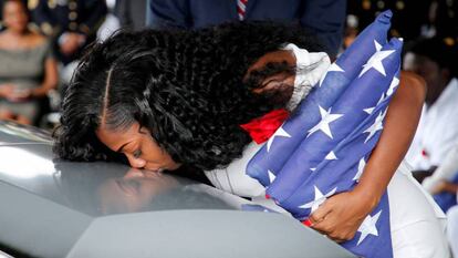 Las palabras de Myeshia Johnson, embarazada de seis meses y madre de dos niños pequeños, han disparado la polémica que desde hace una semana galvaniza a Estados Unidos. El sargento, de 25 años, falleció el 4 de octubre en Níger junto a otros tres miembros de las fuerzas especiales. Un comando del Estado Islámico les emboscó mientras participaban en una operación con soldados nigerinos. Las circunstancias del ataque no han sido aclaradas y desde el primer momento suscitaron dudas. Pero la controversia se agigantó el pasado martes, cuando la viuda del sargento recibió la llamada de condolencia del presidente. Un ritual que pocas veces trasciende y que, en un país en guerra permanente, ha adquirido un carácter casi sagrado.