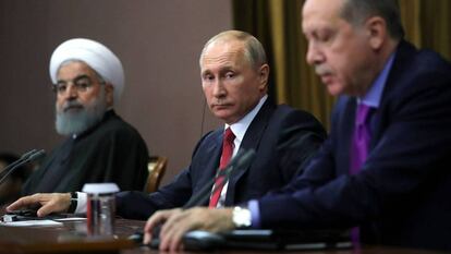 "Corresponde al pueblo sirio determinar su propio futuro (...) Es evidente que el proceso no será sencillo y exigirá compromisos y concesiones de todos los participantes, incluido del gobierno sirio", ha instado el presidente ruso, Vladimir Putin, este miércoles a la entrada de una reunión con sus homólogos iraní, Hasan Rohaní, y turco, Recep Tayyip Erdogan, cada uno promotor de diferentes facciones en el conflicto del país levantino. La reunión, en la ciudad balneario rusa de Sochi, fue convocada para avanzar en una solución a la contienda ahora que la inminente derrota del Estado Islámico en Siria impide posponer por más tiempo la negociación política.
