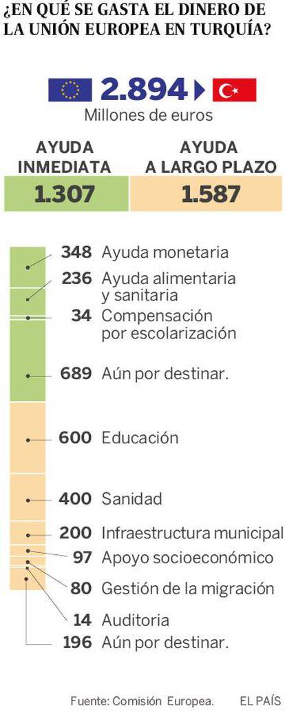 Los Ayuntamientos de las provincias donde se concentran los sirios tambiñen reciben ayudas de la UE. “Antes recogíamos 40 toneladas de basura al día, ahora 160. Y el consumo de agua potable se ha incrementado en un tercio”, asegura Hasan Kara, alcalde de Kilis, una ciudad de 90.000 habitantes que ha visto instalarse en ella a 130.000 sirios. Pese a los recelos de la población local —los profesores reconocen que cuesta convencer a los padres turcos de que sus hijos deben compartir las aulas con los sirios— en Kilis no se han producido mayores incidentes y la convivencia es correcta. “Hemos recibido, de repente, a una cantidad de personas que nos supera en número. Que tienen una cultura y una lengua diferentes de la nuestra. Pero, a pesar de todo, compartimos lo que tenemos", sostiene el primer edil. "Conocemos las necesidades de nuestros huéspedes sirios porque nuestro personal los visita en casa. Podemos atenderlos por menos dinero que en Europa. Pero sin apoyo no podremos continuar dándoles servicios. Y si eso daña la convivencia en Kilis, los conflictos se extenderán por toda Turquía y no importarán los muros que pongáis... los sirios escaparán a Europa”, remata.