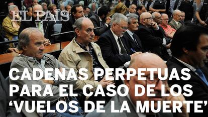 La Justicia argentina condenó por primera vez y con varias cadenas perpetuas a los responsables de los vuelos de la muerte, el sistema de exterminio de los detenidos desaparecidos que acabó con la vida de unas 4.000 personas, lanzadas al mar desde aviones militares después de haber sido drogadas. La sentencia del mayor juicio de la historia de este país, la llamada megacausa de la ESMA, con 54 imputados por los delitos cometidos contra 789 víctimas, fue finalmente histórica y determinó la condena a cadena perpetua de 29 implicados, incluidos algunos de los más conocidos represores, ya condenados por otras causas. Hubo 6 absoluciones y el resto fueron condenados a penas entre 8 y 25 años.