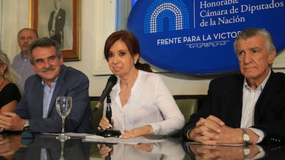 Kirchner se rodeó de legisladores aliados en un salón del Congreso. En ese mismo edificio iniciará el 10 de diciembre su trabajo como legisladora tras ser elegida en octubre. Se la vio evidentemente cansada. Y apeló más de una vez a la lectura para dejar bien en claro la idea que quiso transmitir a los periodistas que la escuchaban, mientras todos los canales de noticias argentinos transmitían en directo sus palabras. “Me quieren callada, pero no me van a asustar”, dijo Kirchner. Luego disparó contra los fundamentos jurídicos de su pedido de detención: “Es una causa inventada sobre hechos que no sucedieron, no hay hechos, no hay delito, esto es despropósito que viola el Estado de derecho y busca provocar daño personal y político a los opositores. No tiene nada que ver con la justicia ni con la democracia. Bonadio lo sabe y Macri lo sabe”.