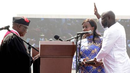 Con el brazo derecho en el aire y el izquierdo sobre la Biblia, el exfutbolista George Weah se ha convertido este lunes en el nuevo presidente de Liberia tras jurar el cargo. Dentro de una elegante túnica blanca y con sus gafas doradas, Weah ha hecho pública, entre olas, aplausos y ovaciones de las 35.000 personas que abarrotaban el estadio Samuel Doe, su declaración de intenciones, sin poder evitar arrancar con algunas referencias a su pasado. “He pasado muchos años de mi vida en estadios, pero el de hoy es un sentimiento como ningún otro”, empezó el nuevo presidente, que toma el relevo de la polémica y galardonada Ellen Johnson Sirleaf. Sin embargo, Weah ha querido también garantizar “no habrá vencedores ni perdedores; hoy somos uno, y el futuro le pertenece a la gente de Liberia”.