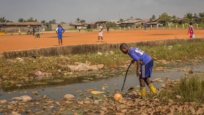 Dos bicis fugaces, un altavoz saturado y ese golpe seco de las botas golpeando al balón. El espacio de tierra donde el nuevo presidente de Liberia, George Weah, empezó su carrera se abre como una bocanada de aire entre el laberinto de chabolas de Claratown. Hay partido amistoso, puestos de buñuelos y la juventud de medio barrio hormigueando en micro actividades. “Weah, desde joven, siempre ha sido un gentleman” asegura contundente y orgulloso Myer Beteah, ex presidente del Young Survivors, mientras camina despacio por la larga plataforma de cemento que llega al campo de fútbol, en su acceso más firme; el resto son finas tablas de madera que ejercen de puente sobre la fosa de porquería que sella el terreno. Como si fuera una fortaleza. El Survivors -como todos le llaman aquí- fue el equipo en el que Weah empezó a despuntar. “Aquí, en este mismo campo, jugaba nuestro presidente, aquí le conocimos, y aquí descubrimos su enorme determinación, que ha demostrado en toda su vida, no solo en el fútbol”, desgrana Myer, paseando entre balones perdidos.