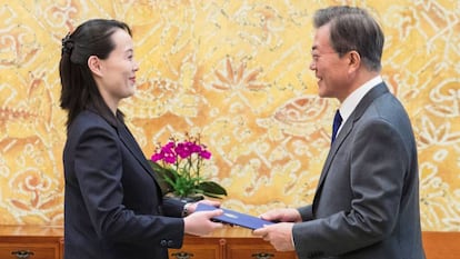 El incipiente deshielo entre las dos Coreas empieza a cobrar forma y, por el momento, a toda velocidad. Kim Yo-jong, la hermanísima del líder norcoreano, Kim Jong-un, mantuvo este sábado la primera reunión de un miembro de su dinastía con un presidente de Corea del Sur, Moon Jae-in. Y llegó con regalos: una invitación personal de su hermano al jefe de Estado del Sur para visitar Pyongyang “cuando le sea conveniente”. Una invitación impensable hace dos meses, tras un año de tensiones por las pruebas nucleares del Norte. Sería la primera reunión de dos líderes coreanos en una década, y solo la tercera en la historia.