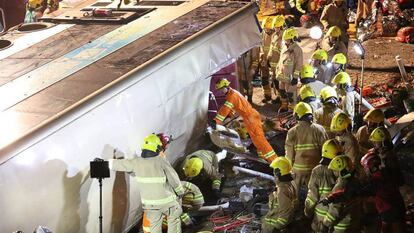 Al menos 19 personas han muerto y 40 han resultado heridas este sábado después de que un autobús de dos pisos en Hong Kong se saliera de la carretera y volcara en una autovía del norte de la ciudad, según ha anunciado la policía de la excolonia británica. El suceso, uno de los peores que ha sufrido esta isla en años, ha tenido lugar pasadas las seis de la tarde hora local y ha afectado a un autobús de línea que recorría un tramo de nueve kilómetros en una autovía entre el distrito de Sha Tin y el de Tai Po, dos de los 18 con los que cuenta este territorio autónomo chino con casi siete millones y medio de habitantes.