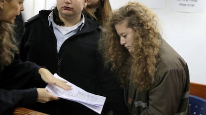 Acaba de cumplir 17 años en la celda y ya es una prisionera célebre. Lleva casi dos meses entre rejas, a la espera de que este martes se iniciara su juicio en un tribunal militar en la sala de vistas del penal de Ofer, a las afueras de Ramala, en Cisjordania bajo ocupación militar. Sobre su cabeza salida de un lienzo de Botticelli pesan 12 acusaciones de asalto, desacato a las tropas e incitación a la violencia en las redes sociales, entre otros cargos. La justicia castrense, que ha ordenado que la vista se desarrolle a puerta cerrada para la prensa y el cuerpo diplomático, puede imponerle una condena de hasta 10 años de cárcel. Pero Ahed Tamimi se ha convertido ya en símbolo de resistencia para los palestinos. Su detención por Israel, precisamente, la ha dado a conocer a escala global. El juicio ha sido aplazado hasta el 11 de marzo: la adolescente de la melena pelirroja tendrá que permancer otro mes más encarcelada.