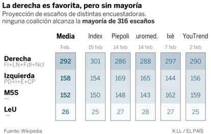 El promedio de sondeos de EL PAÍS coloca como primera fuerza a la coalición de centroderecha, que ronda el 38% de los votos. Se combinan ahí los votos de Forza Italia —otra vez con Silvio Berlusconi que, inhabilitado, ha delegado en el presidente del Parlamento Europeo, Antonio Tajani—, La Liga, Fratelli d'Italia y Nosotros con Italia. Le siguen la amplia coalición de izquierdas que lidera el Partido Democrático de Matteo Renzi —28%, incluidos sus socios— y el Movimiento 5 Estrellas (M5S) —27,7%—.
