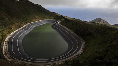 Cinco aerogeneradores, dos depósitos de agua, cuatro turbinas hidráulicas y una central de bombeo conforman el experimento renovable que arrancó en 2014 en la isla. La clave de este proyecto de 82 millones de euros está en combinar la rebeldía del viento con la docilidad del agua estancada y así atajar el punto débil de las energías renovables: el almacenamiento. “Una parte de la energía que produce el parque eólico va directamente a los clientes y otra a unas bombas que suben agua desde un depósito inferior casi al nivel del mar a uno superior a una cota de 700 metros”, explica Juan Pedro Sánchez, consejero delegado de la central. Cuando no hay viento, se genera electricidad con el salto de agua de un embalse a otro. Gracias a este sistema, el pasado febrero la isla cumplió un hito: logró abastecerse durante 18 días seguidos con energía 100% renovable.