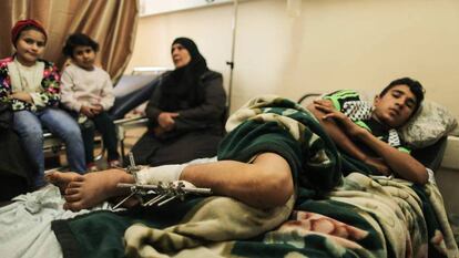 En otra habitación del mismo complejo hospitalario, el taxista Mohamed Shayed, de 40 años, se halla rodeado por toda su familia. Su esposa, Shadia, de 29 años, le advirtió de que no fuera a la manifestación del viernes con sus dos hijos —Fayez, de 12 años, y Hatem, de 10—, pero él la tranquilizó diciéndole que solo iba a ser un acto festivo. Una bala mágica le atravesó limpiamente la pierna izquierda, pero le astilló la derecha en siete puntos. “Estábamos muy lejos, a casi un kilómetro de la frontera”, precisa, “y me quedé con los chicos en la parte de atrás de la marcha, en la zona de Nahalot, cerca de la ciudad de Gaza”. Los dispositivos metálicos que le han insertado para recomponer su osamenta le impiden moverse de la cama, pero en el hospital no hay sillas de ruedas. “No como para no tener que ir al baño”, admite, “y racionamos los calmantes porque no podemos pagarlos”.