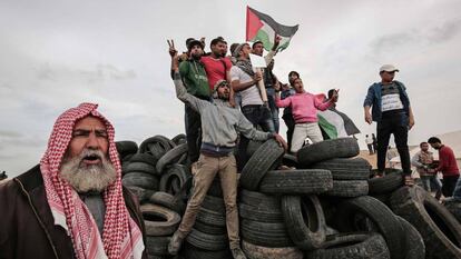 Los jóvenes de Jan Yunis acarrean neumáticos viejos, espejos metálicos y cubos de plástico hasta la frontera del sureste de Gaza. Han levantado un campamento en el pago de Jusaa, a 400 metros de las mirillas de precisión de los francotiradores del Ejército de Israel. La llegada de cada cargamento es celebrada con gritos de júbilo por centenares de veinteañeros en paro. Se preparan para volver a movilizarse esta semana en un nuevo viernes de la ira tras las multitudinarias manifestaciones del 30 de marzo.