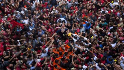 El jueves, ni una hora después de que el juez Sérgio Moro emita la orden de prisión contra el expresidente, condenado a 12 años por corrupción, este ya se ha encerrado en sus familiares paredes, arropado por miles de fieles y aliados. Son las ocho de la tarde. Tiene 21 horas para entregarse. Entre sus partidarios y él mismo hay una buena distancia. Ellos están en la calle, donde algunos pasarán la noche y donde han hasta instalado una cocina portátil. Él está en la segunda planta, a varias salas de distancia, y solo pueden franquearlas sus aliados más poderosos. Exministros, diputados y senadores del Partido de los Trabajadores (PT), la agrupación de Lula. También de los partidos comunistas, socialista y laborista, las principales formaciones de la izquierda brasileña. La también expresidenta Dilma Rousseff, protegida política de Lula en días mejores, llega esa noche. Pero ni siquiera dentro de ese círculo íntimo se sabe a ciencia cierta qué va a pasar ahora. Se especula que el expresidente se entregará pronto, pero también que permanecerá allí hasta el final. El único capaz de controlar su futuro parece ser el propio Lula.