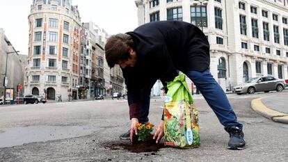 Se puede enviar una carta al Ayuntamiento. Se puede andar uno quejando día sí, día también, con amigos, familiares y vecinos. O se puede salir de casa con un ramillete de flores, un poco de tierra y una regadera verde de plástico llena de agua, y colocar una planta donde antes un orificio actuaba como vergonzante recordatorio del deterioro urbano. El holandés Anton Schuurmans, de 29 años, ha elegido esta última opción para denunciar la masiva presencia de baches en las calles de Bruselas. Cuando detecta uno de ellos, transforma el molesto agujero en un geranio o un narciso, que asoman como perturbadores avisos de la presencia de socavones para viandantes, ciclistas o conductores. También como una llamada a la clase política a corregir el problema.