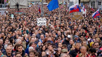 Ambos asesinados investigaban asuntos de corrupción y habían señalado a sus Gobiernos. Pero, como en el caso de Caruana, asesinada con un coche bomba el pasado octubre, el crimen de Kuciak y su prometida está lejos de ser resuelto. En marzo, las autoridades detuvieron a siete personas en relación con el asesinato, todas de la red italo-eslovaca; uno de ellos, el controvertido Antonino Vadala. Solo él permanece en prisión. Pero no por el caso del periodista, sino por sus cuentas pendientes con la justicia italiana. La falta de respuestas indigna a la ciudadanía, que semana tras semana sigue saliendo a la calle. El SMER, que gobierna en coalición con otros dos partidos, ha evitado gracias a su apoyo las elecciones anticipadas, explica el diputado opositor Gabor Grendel. Este domingo, unas 30.000 personas se congregaron en Bratislava para exigir la dimisión del presidente de la policía, a quien consideran inhabilitado para seguir en el cargo. El nuevo ministro de Interior, encargado de nombrar y cesar a la autoridad policial, ha eludido comentar el caso.