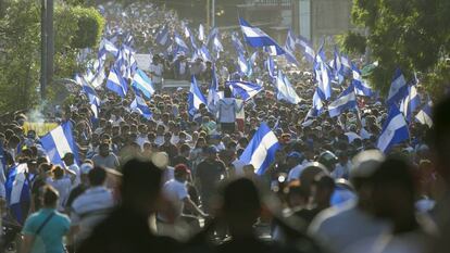 Fue una demostración de fuerza cívica inédita en Nicaragua en la última década. Decenas de miles de nicaragüenses, vestidos de blanco y ondeando la bandera nacional, recorrieron varios kilómetros en Managua después de que la represión de las protestas de los últimos días haya dejado al menos 25 muertos. Coreaban consignas contra el régimen del presidente Daniel Ortega, que ha sofocado con dureza las manifestaciones originadas por la reforma al Seguro Social promulgada el pasado martes. Aunque el presidente derogó las reformas, la marcha convocada por las cúpulas empresariales se desarrolló de forma pacífica, una muestra del rechazo de los ciudadanos a la violencia desatada por el Gobierno.