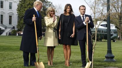 Fue uno de los primeros actos simbólicos de la visita del presidente de Francia, Emmanuel Macron, al estadounidense Donald Trump. El pasado lunes, acompañados de sus esposas, todos impecables, plantaron un roble en los jardines de la Casa Blanca. El árbol, regalo del mandatario francés procedía de una zona boscosa en la que lucharon soldados estadounidenses en la Primera Guerra Mundial, en 1918. Pero días más tarde... el obsequio no está en su lugar.