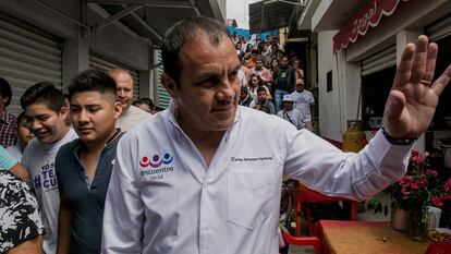 A esa hora de la mañana el sol se cuela en el mercado como espadas láser. Dentro, el hombre que lidera las encuestas para ser el próximo gobernador del Estado de Morelos con casi 30 puntos de ventaja sobre el PRI (Revolucionario Institucional) el PAN (Acción Nacional) o el gobernante PRD se siente cómodo caminando entre changarros.