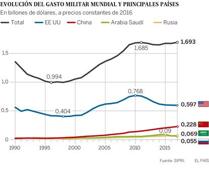 Rusia, en cambio, camina a la contra. Tras el espectacular aumento de la inversión bajo el mandato de Putin —desde 20.000 millones en 2001 a 70.000 en 2016—, el Kremlin ha tenido que frenar debido a las graves dificultades económicas vinculadas a las sanciones internacionales y a la caída del precio del petróleo. La actual retórica de Putin parece privilegiar las condiciones de vida de los ciudadanos, frente a la inversión en Defensa. Pero el repunte del precio del petróleo lleva a pensar que pueden abrirse nuevas posibilidades de gasto también para Rusia.