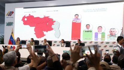 El sucesor de Hugo Chávez salió del palacio de Miraflores y compareció ante miles de seguidores para exhibir una “victoria popular permanente” y habló de diálogo. Su ministro de Comunicación e Información, Jorge Rodríguez, se empleó ayer en demostrar, junto a la presidenta de la Asamblea Nacional Constituyente, Delcy Rodríguez, que la participación no fue tan mala. Confrontó las cifras con las de países vecinos como Colombia y de Estados Unidos. No obstante, el término de comparación para medir estas elecciones se halla en la propia historia de Venezuela. En 2013, acudió a las urnas casi el 80% del censo; en 2012, el 80,5%; y en 2006, el 74,7%. Nunca en las últimas décadas unas presidenciales causaron tanto rechazo. El ministro también se pronunció, durante una conferencia de prensa, sobre las críticas y las denuncias de la llamada comunidad internacional, una expresión que él mismo dijo censurar. Trató de restar importancia a las presiones de las principales instancias americanas y europeas y afirmó lo que importa es lo que dice Venezuela.