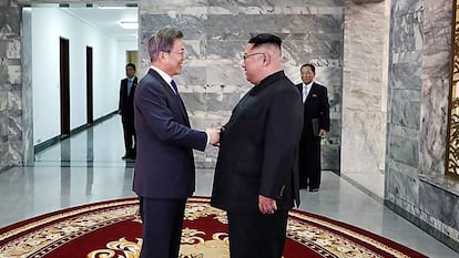Las imágenes distribuidas hasta el momento muestran a los dos líderes sonrientes, sentados frente a frente en una mesa tras la que se aprecia un retablo del monte Paektu, el más importante en la tradición coreana. La hagiografía del Norte asegura que allí nació Kim Jong-il, padre del actual líder supremo norcoreano, aunque según documentación rusa ocurrió en Siberia. Otras fotos muestran a Moon y Kim abrazándose cariñosamente en el exterior de un Panmunjak, el pabellón de Corea del Norte en el área de seguridad conjunta, engalanado con alfombras rojas para la ocasión; también, dándose la mano con cordialidad en lo que parece uno de los vestíbulos.