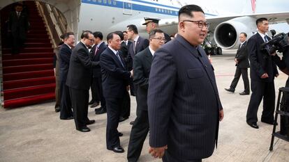 Kim llegó antes de las 14.40 hora local (8.40 hora española) a Singapur acompañado de Kim Yong-cho, su mano derecha, con quien Trump se reunió recientemente en Washington; el canciller norcoreano, Ri Yong-ho; Ri Su-Yong, responsable de Exteriores del Partido; y Kim Chang-son, su jefe de Gabinete. Lo hizo a bordo de un 747-400 de Air China y no en el Chammae-1, el Il-62 soviético que hace las veces de avión presidencial. El avión chino está mejor preparado para largos vuelos y tiene un interior más lujoso que la nave rusa de fuselaje estrecho. Una llegada más presidencial para Kim, que fue recibido en la pista de Changi por una delegación singapurense encabezada por el ministro de Exteriores, Vivian Balakrishnan, con quien se reunió en Pyongyang la semana pasada.