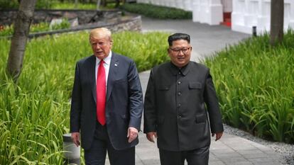 Trump dejaba después que fuese el norcoreano quien caminase algo avanzado mientras le daba alguna palmada amistosa —o paternalista— en la espalda, imponiéndose como anfitrión en casa ajena. Las primeras imágenes de los dos sentados en una acogedora sala del hotel eran elocuentes. Y no sólo por la reiterativa oratoria de Trump: “Un tremendo éxito. Será tremendamente exitoso”, aventuraba el inquilino de la Casa Blanca sobre el encuentro. También por el contraste entre su léxico, más bien modesto, y el elaborado lenguaje formal de Kim.