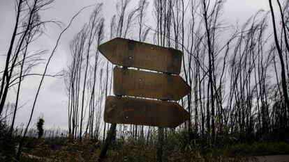 El único sonido que se oye en las 10.000 hectáreas calcinadas por los incendios del pasado año en el centro de Portugal es el del rugir de una motosierra. Pocos segundos después, el de un árbol en caída libre chocando contra el barro. Cuentan los vecinos que el verano fue “infernal” y que "todo lo que podía fallar, falló". La sequía convirtió los campos en combustible; el fuerte viento transformó las llamas en bolas de fuego que arrasaron con las copas de los eucaliptos, que se consumían como cerillas en cuestión de segundos; las carreteras se convirtieron en trampas mortales donde casi 70 personas murieron, según el relato de los bomberos, "derretidas" a causa de unas temperaturas de más de 800 grados. Un año después, la zona está paralizada: corrales sin gallinas, campos sin ganado y señales de tráfico ilegibles por la densa humareda. La Unión Europea aprobó el pasado invierno una ayuda de 50,6 millones de euros del Fondo de Solidaridad para recuperar la zona. 12 meses después de la pesadilla, ni las víctimas ni las autoridades locales han visto un céntimo.