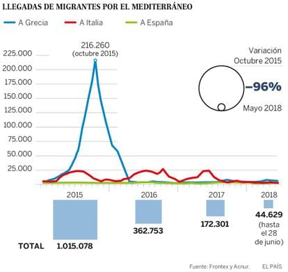 La migración sacude la agenda europea en el momento de menor presión de flujos desde la crisis de 2015: aquel año entraron en Europa más de un millón de inmigrantes; en lo que va de 2018 apenas 43.000, según los datos de Acnur. Da igual: las tensiones políticas en Alemania, con un Gobierno que pende de un hilo por el movimiento de refugiados, y el ardor del discurso antiinmigración en Italia caldearon este jueves el ambiente de la cumbre de jefes de Estado y de Gobierno, centrada principalmente en este conflicto.