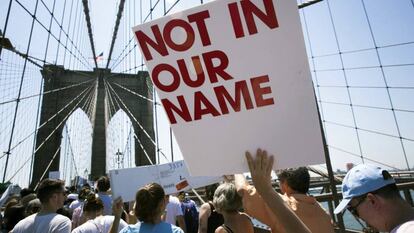 Los manifestantes insistían en que no son radicales. “Hasta aquí hemos llegado”, comentaba Rob, mientras camina con su familia hacia Brooklyn, “sentí que debía hacer más. Es una política horrenda”. Maya, de 12 años, es la primera vez que acude a una marcha. “Es importante movilizarse”, valora mientras muestra una pancarta en la que se puede leer “buscar refugio no es un crimen”. Le acompaña su madre, Diane, “es contrario a todos los valores en los que creemos’
