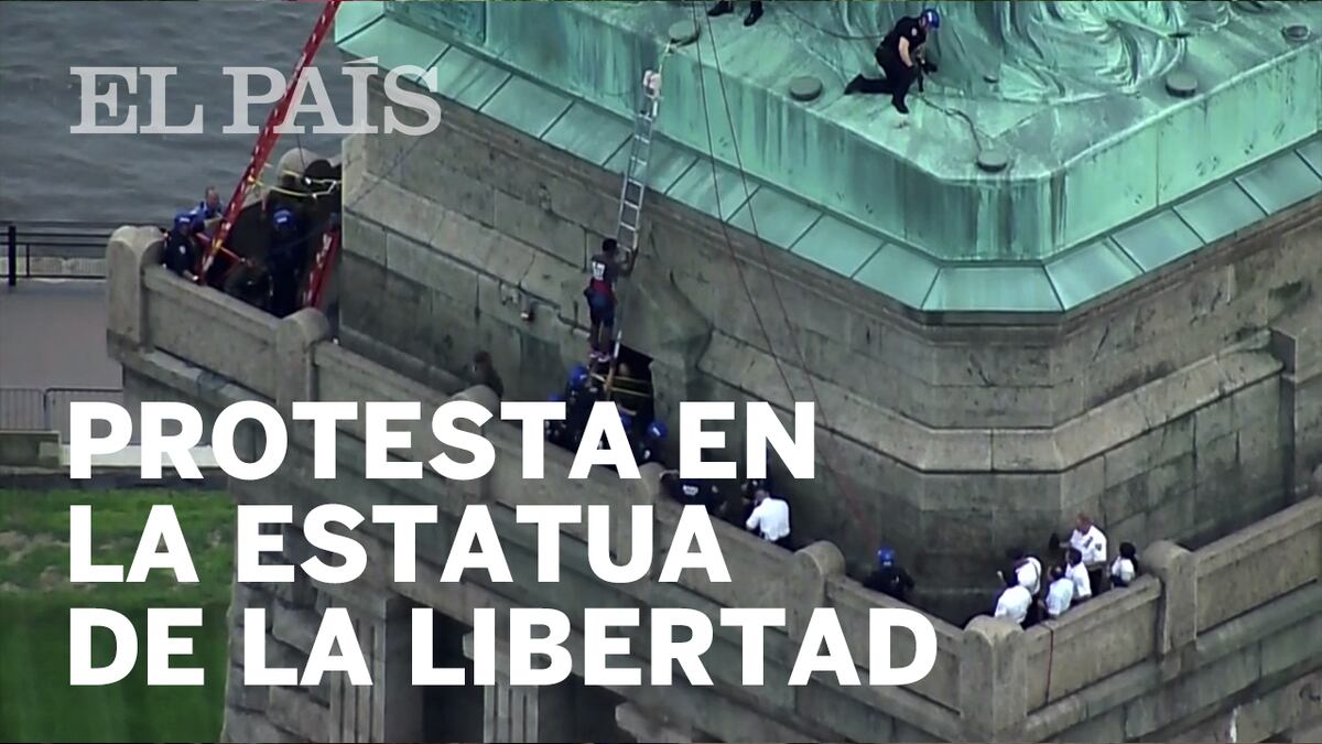 Una mujer escala la estatua de la Libertad en protesta por la política migratoria