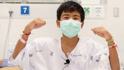 "Muchas gracias, estamos bien". Es el mensaje de Ekarat Wongsukchan, uno de los menores rescatados de la cueva de Tailandia desde el hospital donde están ingresados, en la provincia de Chiang Rai. Los 12 jóvenes futbolistas y su entrenador saldrán del centro médico el próximo jueves. "Los 13 jabalíes salvajes [como se les conoce] están en buena condición física y con buen ánimo", afirmó este sábado el ministro de Salud Pública, Piyasakol Sakolsattayatorn. Las autoridades han aconsejado tanto a los pequeños como a sus padres pasar el tiempo con amigos y con la familia y evitar dar entrevistas, ya que podría "desencadenar síntomas de estrés traumático". El operativo para rescatar a los pequeños de la gruta de Tham Luang duró tres días, después de haber sido localizados por dos buzos británicos tras nueve jornadas en paradero desconocido.