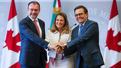 Tras casi un año de negociación formal –las conversaciones informales empezaron, en realidad, mucho antes–, México y Canadá se han unido ante la adversidad que supuso la llegada de un ferviente defensor del proteccionismo y del mercantilismo a la Casa Blanca. Ha sido su particular mecanismo de protección frente a la tormenta. "Nuestra relación es cercana, entrañable y extraordinariamente positiva", ha destacado este miércoles Videgaray. "Y en los últimos 18 meses [desde que Trump tomó posesión] el contexto nos ha acercado todavía más. Compartimos principios y objetivos comunes: hacemos equipo y actuamos como un equipo".