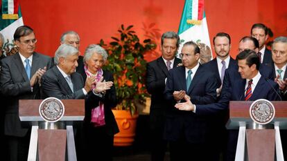 En su tercer encuentro tras la victoria de López Obrador el 1 de julio, el actual mandatario y el próximo presidente de México escenificaron el inicio formal de la transición entre ambos Gabinetes, toda vez que previamente el líder de Morena no había recibido la notificación oficial de ser el presidente electo. Un formalismo al que acompañó una reunión inusual de todos los integrantes de los dos Gobiernos. Un encuentro del que ambos dirigentes destacaron su clima de “respeto y cordialidad” y su compromiso de colaborar para que el 1 de diciembre, cuando López Obrador tome posesión del cargo, el futuro gobierno pueda trabajar con toda la información disponible.
