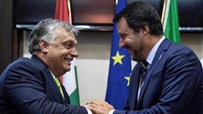 Dos estandartes del populismo europeo, el primer ministro húngaro, Viktor Orbán, y el ministro del Interior y líder de la ultraderechista Liga, Matteo Salvini, se han reunido este martes en Milán para unir posturas antinmigración. Era una reunión meramente política, no institucional, y de ahí que se intentara dejar fuera al Movimiento 5 Estrellas, socio de Gobierno de la Liga. Pero la sede elegida para el encuentro fue la prefectura de Milán, una sede institucional, y en la posterior rueda de prensa se presentaron ante sus respectivas banderas con un recado común: reducir el peso de Bruselas y blindar las fronteras europeas. Y con un eslogan compartido: “Se puede frenar la inmigración”. Con esta afinidad sentaron las bases de lo que quieren que sea una alianza antinmigración. “Será el primero de muchos encuentros”, concluyó Salvini.