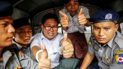 Las expectativas pesimistas se han cumplido. Los periodistas birmanos de la agencia Reuters Wa Lone y Kyaw Soe Oo han sido condenados este lunes a siete años de cárcel por un tribunal de Myanmar (antigua Birmania), acusados de violar la Ley de Secretos Oficiales mientras documentaban la matanza a un grupo de rohinyás. La minoría musulmana ha huido en masa al vecino Bangladés desde hace un año debido a una campaña de persecución del Ejército birmano calificada de “intento de genocidio” por un reciente informe de la ONU.