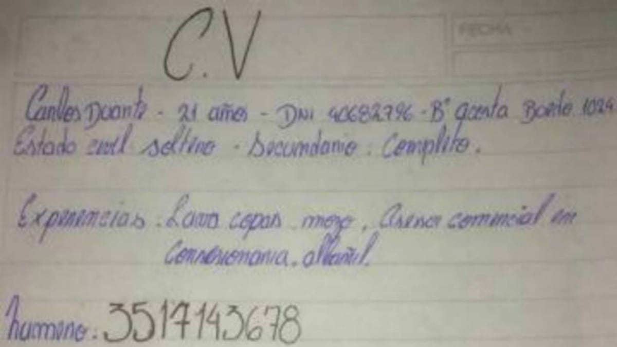 López le respondió que en ese momento no había ninguna oferta laboral, pero que le podía dejar su CV si quería para más adelante. "Lo qué pasa es que no tengo ni para imprimir", le contestó el joven. Cuando la empleada le pidió que tomase asiento en una mesa y lo escribiese en la hoja que le iba a dar, Duarte le explicó que no hacía falta porque llevaba encima un cuaderno y un bolígrafo. "Y así quedó de prolijo su CV", señaló López junto a una fotografía del currículum en el que puede leerse que ha trabajado como albañil, asesor comercial, camarero y lavacopas.