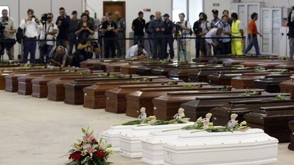 Pocos migrantes muertos en el Mediterráneo tienen funeral. Pero los más de 360 ahogados el 3 de octubre de 2013 frente a Lampedusa fueron despedidos con un funeral de Estado en Italia. El suceso horrorizó a Europa. Aquellas filas de ataúdes idénticos de madera, con cuatro minúsculos féretros blancos en primera fila, se convirtieron en un símbolo. Hubo declaraciones políticas grandilocuentes que cristalizaron en un cambio de la política migratoria italiana y europea. Rescatar a quienes se lanzaran a la peligrosa travesía se convirtió en una efímera prioridad. Cinco años y 14.000 ahogados después (los últimos 11, el martes en aguas marroquíes) esto es lo que ha cambiado (y lo que no) en el Mediterráneo mientras 1,8 millones de personas llegaban irregularmente por mar.
