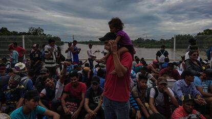 El paso fronterizo, uno de los dos que conectan a Tecún Umán con Ciudad Hidalgo en México, está completamente colapsado. Es un barrio que respira el ambiente de la caravana: los niños juegan al fútbol, los bebés gatean entre las lonas de plástico y los adultos matan el tiempo bajo la casa que han erigido junto a un letrero de migración. Se venden cigarros, agua, paletas de hielo. El calor y la humedad sobre el río Suchiate han arreciado y son sofocantes. Los inmigrantes han organizado tres cordones de paso para controlar el flujo hacia la aduana de México. Y aunque las solicitudes de refugio y de tránsito avanzan a paso lento, la desesperación es palpable. “No vemos resultados”, reclama Lobo Hernández, mientras custodia uno de los cercos.