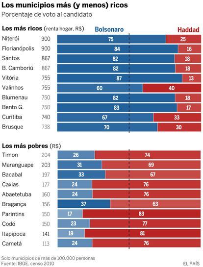 Bolsonaro ganó en las 10 ciudades más ricas de Brasil. En muchas de ellas aplastó a Haddad, logrando hasta seis veces más votos. Haddad se impuso, en cambio, en las 10 ciudades más pobres de Brasil.