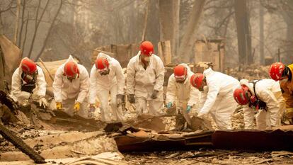 Hay una lista en Paradise que no es de muertos, sino de desaparecidos. Personas a las que sus familiares no encuentran desde el pasado jueves. Cada día que pasa y esa lista no baja, el trabajo se hace más macabro para cientos de militares y voluntarios de antropología forense que han llegado a esta localidad de California para intentar encontrar a las víctimas del incendio más letal y destructivo de la historia del Estado. Son los únicos que caminan ya por esta ciudad, entre chatarra, ceniza y un humo blanco asfixiante, como una niebla tóxica permanente.