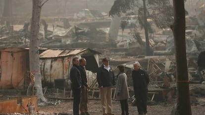 Trump hizo estas declaraciones en el centro de la tragedia. El presidente pudo comprobar in situ el grado de destrucción indescriptible que ha sufrido Paradise, todavía envuelto en un humo blanco tóxico que llega a cientos de kilómetros. Lo hizo acompañado del gobernador electo de California, Gavin Newsom, y el saliente, Jerry Brown. Los dos líderes han sido duros críticos de Trump, convertidos en los jefes de un Estado que se ha autodeclarado como la resistencia a Trump al máximo nivel institucional. La imagen de los tres en Paradise era tan impensable hace una semana como el incendio mismo.