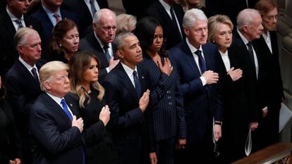 Republicano de vieja guardia y militar condecorado, su adiós recuerda al del senador John McCain, un héroe de la guerra de Vietnam, estimado por sus rivales políticos, ese tipo de político con el que a EE UU le gusta identificarse. Aquel funeral, el pasado verano, se convirtió en una bofetada a Trump: el presidente no fue invitado y los discursos de Obama y Bush arrojaron críticas encubiertas a la política del actual mandatario. Pero hubo tregua este miércoles en Washington, una tregua preparada con tiempo. La familia, según publicó The Washington Post, había hecho llegar al presidente que sería bienvenido al funeral, llegado el momento, y que las palabras de la ceremonia se centrarían en la vida y obra del difunto, no en las discrepancias políticas.