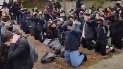 En el vídeo del arresto de unos 150 adolescentes en Mantes-la-Jolie, a 57 kilómetros de París, se puede escuchar una voz que, con sorna, dice a los jóvenes, que permanecen callados y serios: “Esto sí que es una clase obediente”. Pero ni ese comentario anónimo ni las propias imágenes filtradas explican todo el contexto, que según el ministro del Interior, Christophe Castaner, obedece a una situación de “verdadera violencia urbana” alentada en los últimos días por elementos ajenos a la protesta escolar que, a compás del movimiento nacional de los chalecos amarillos, ha retomado las protestas contra la reforma escolar del Gobierno de Emmanuel Macron. Según subrayó Castaner este viernes en una comparecencia ante la prensa, en los últimos días, en Mantes-la-Jolie, en la comuna de Yvelines, se han registrado numerosos actos de violencia y se constató que a las protestas de los liceos se había sumado “un centenar de enmascarados armados con palos y artefactos incendiarios, con la firme intención de enfrentarse a las fuerzas del orden” y que protagonizaron “saqueos” y ataques a automovilistas. Esa es la situación con la que se encontraron, explicó Castaner, los 12 policías que tuvieron que arrestar a los más de 150 adolescentes, motivo por el que procedieron de la forma que lo hicieron, obligándoles a arrodillarse con las manos en alto —“un procedimiento clásico”, afirmó— para evitar que huyeran antes de ser llevados a comisaría.