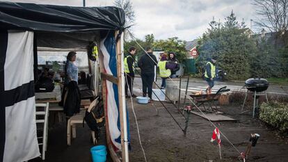 La rotonda de Ploërmel —un pueblo en el centro de Bretaña, tierra de bosques legendarios, druidas y menhires— es desde hace tres semanas el lugar de guardia permanente de una veintena de activistas ataviados con la emblemática prenda fluorescente obligatoria en los automóviles. Han construido una cabaña de madera. Dentro, unos sofás y un colchón destartalado donde duermen por turnos. Fuera hay una barbacoa con salchichas.